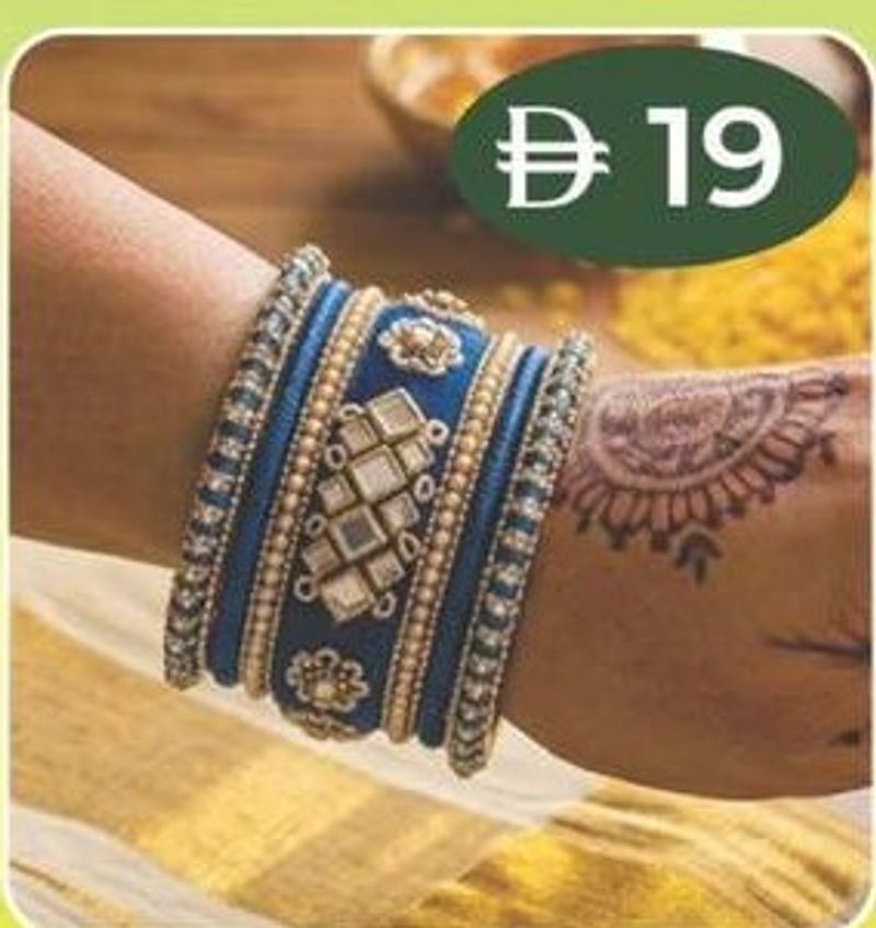 Set of blue and gold bangles with intricate patterns, ideal for festive occasions.