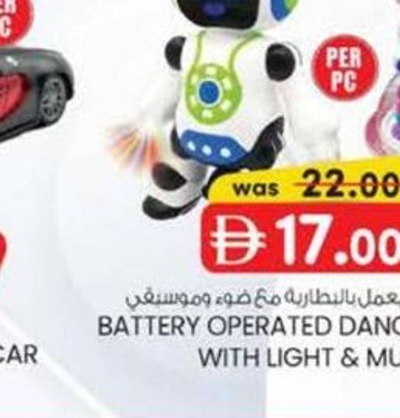 A battery-operated dancing robot that features lights and music, entertaining children with its movements.