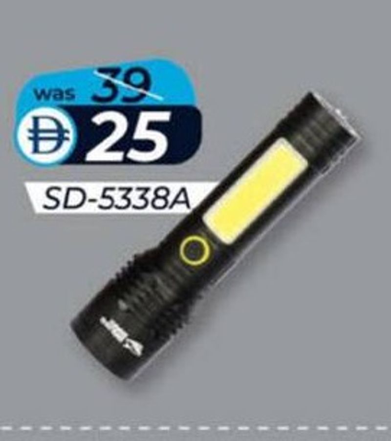 Compact and bright flashlight, model SD-5338A, ideal for everyday use.