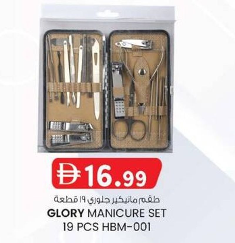 A 19-piece Glory Manicure Set, HBM-001, containing various tools for nail care.