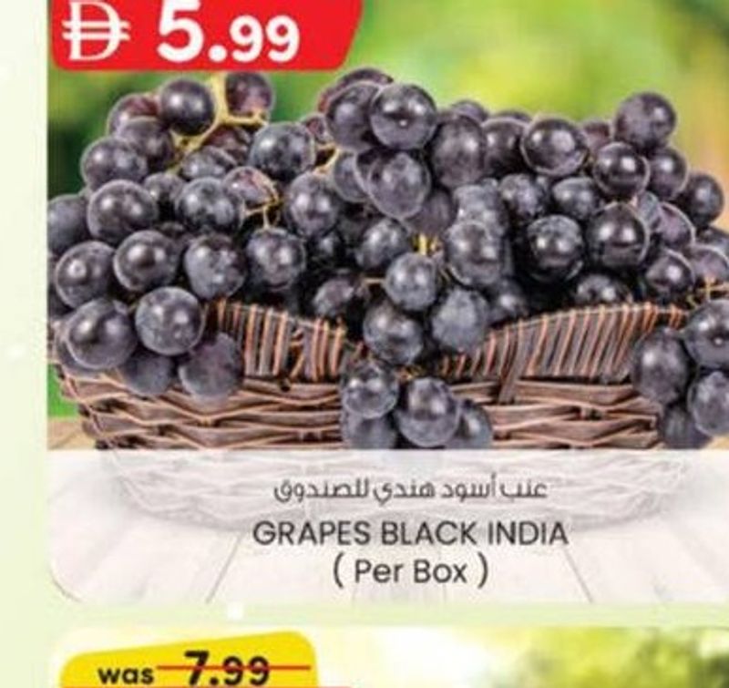 Black grapes from India, sold per box.
