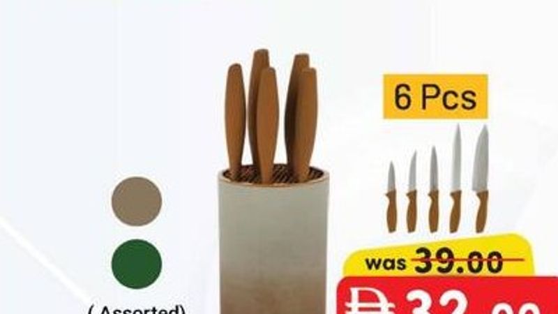 A 6-piece knife set with a holder, available in assorted colors.