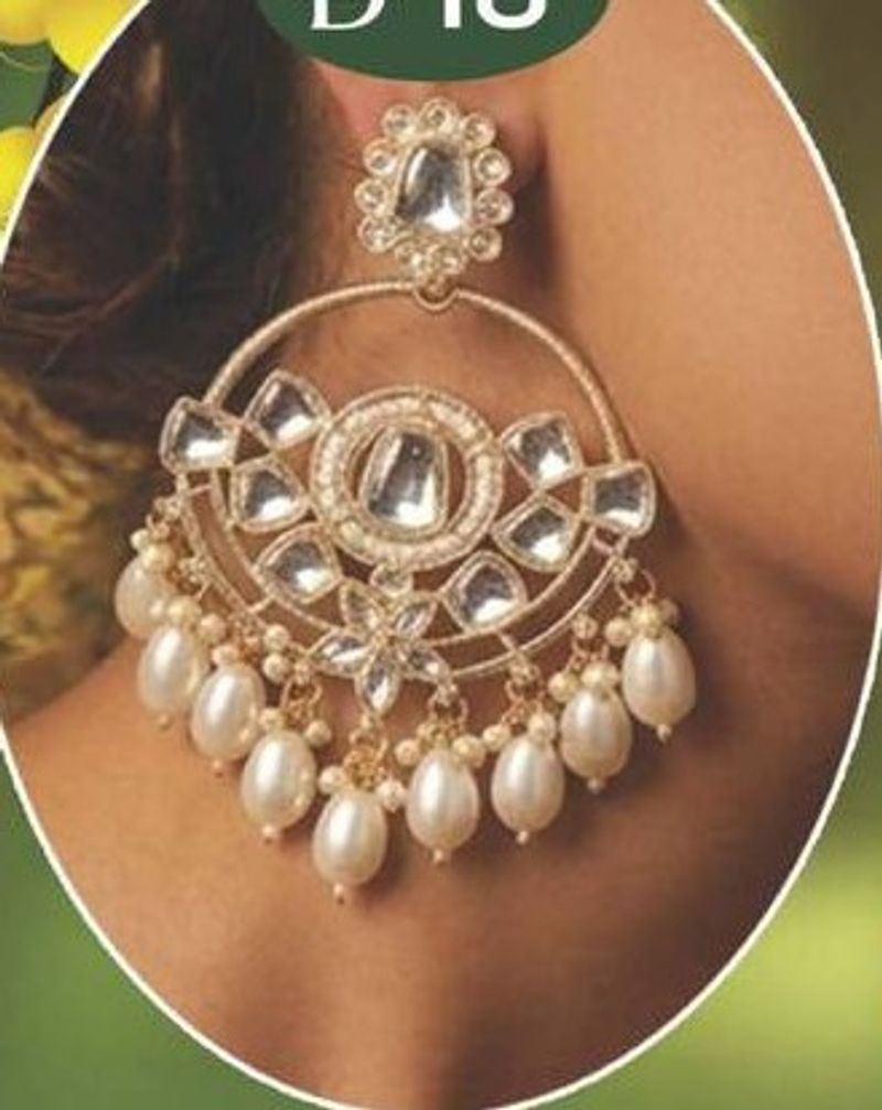 Elegant ladies earring featuring a large round design with central stone and dangling pearls.