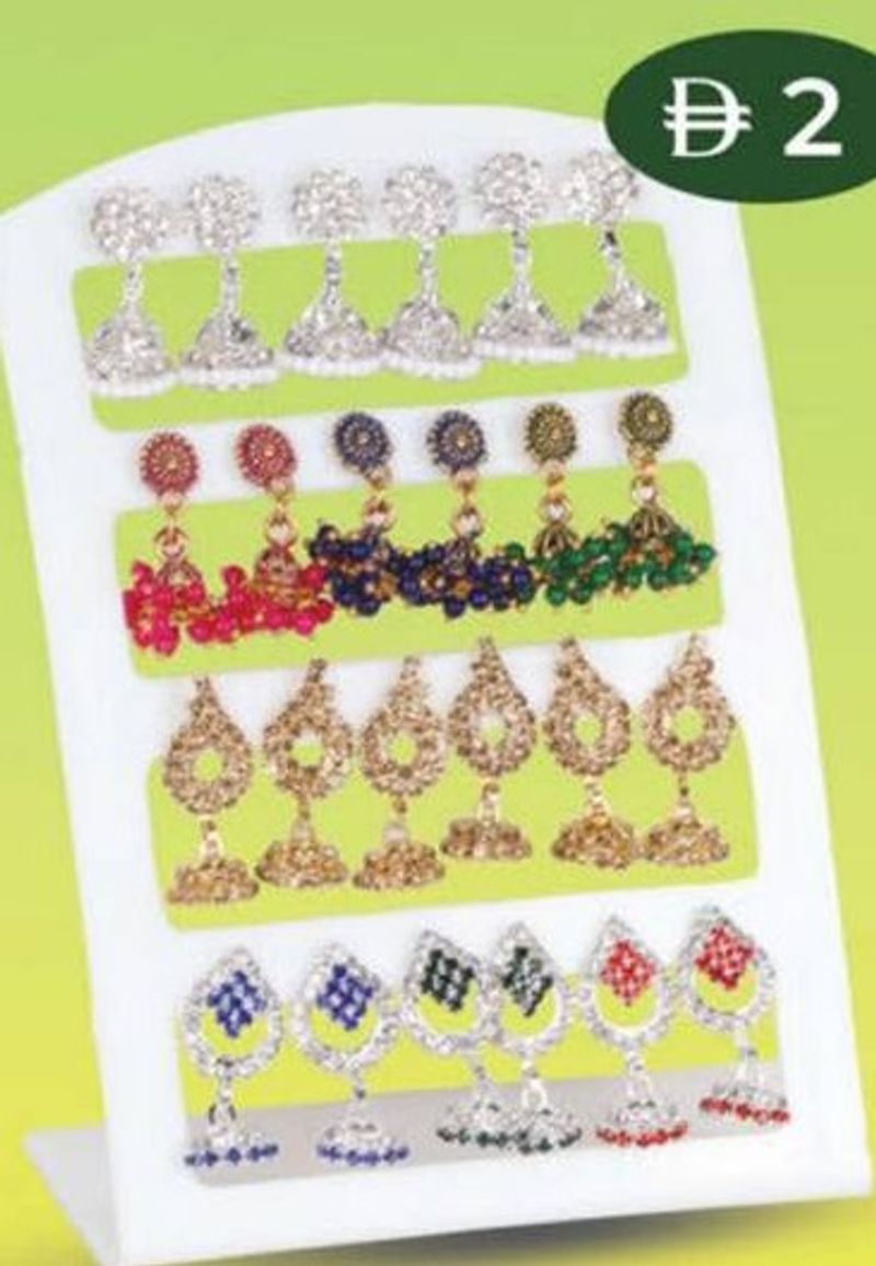 A display stand featuring multiple pairs of fashion earrings in various colors and designs, sold per pair.