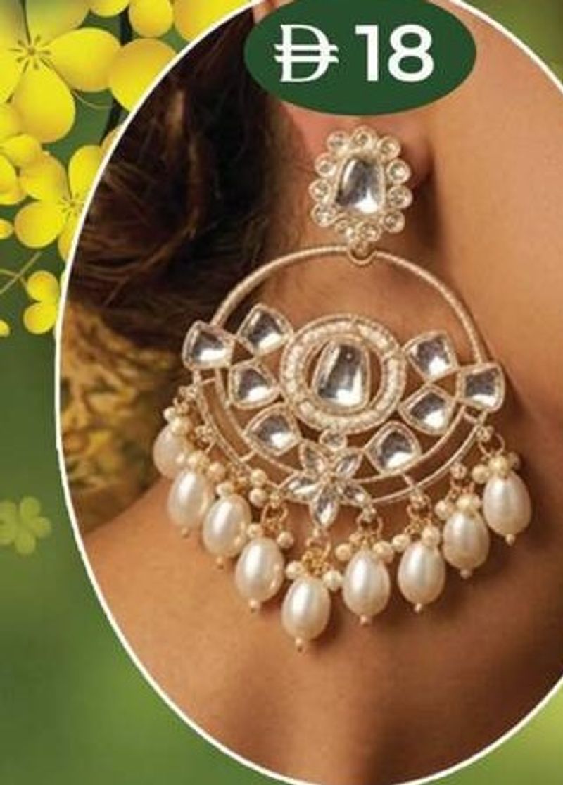Gold-toned earrings with clear stones and pearl drops, featuring a traditional design.