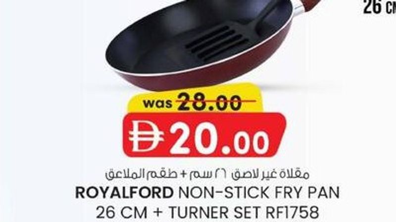 A 26 cm Royalford non-stick fry pan with a turner set.