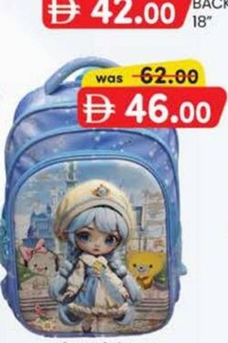 A 16-inch school bag for girls, featuring a doll character design.