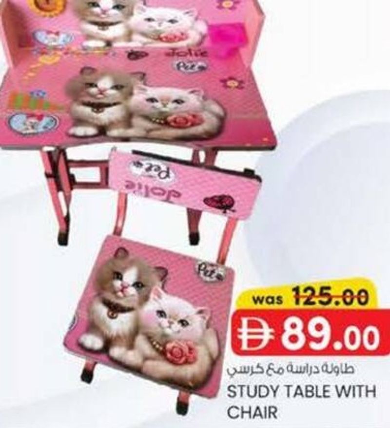 A children's study table and chair set featuring a pink design with cat illustrations, perfect for young learners.