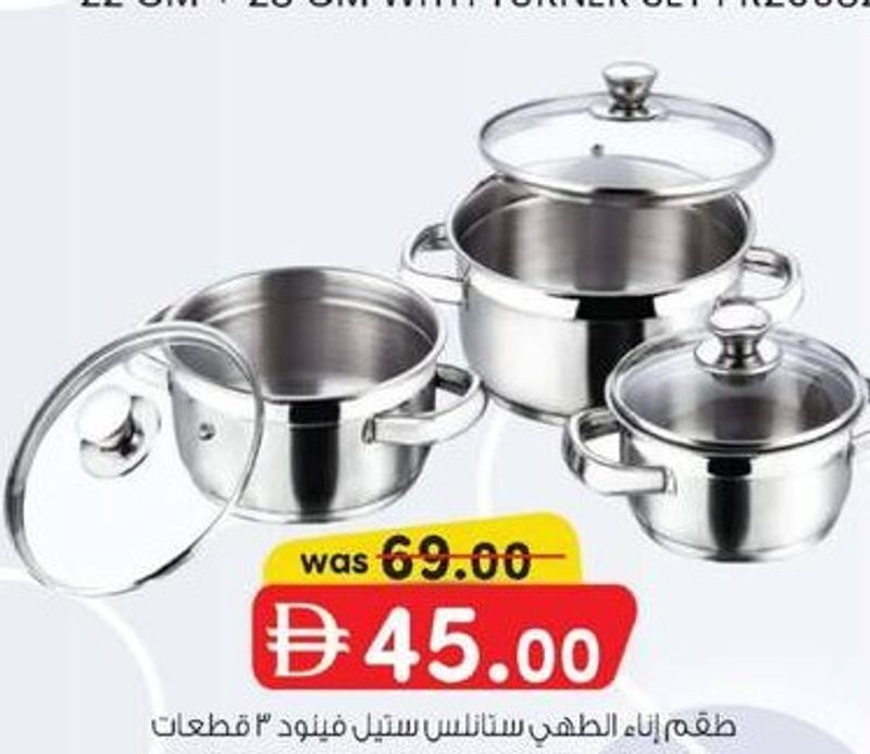 A 3-piece stainless steel cookware set suitable for induction cooktops.