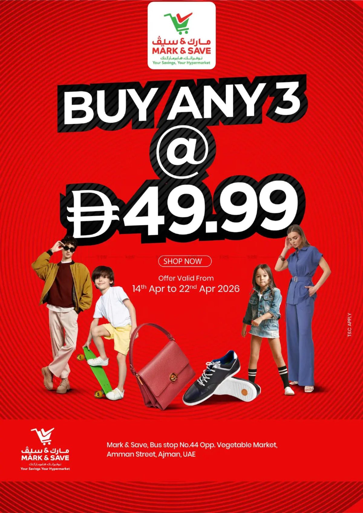 Mark & Save has released Buy Any 3 At AED 49.99 catalog in Ajman, UAE - Industrial Area 1 from Apr 14, 2026 to Apr 22, 2026 in 1 branch(s).