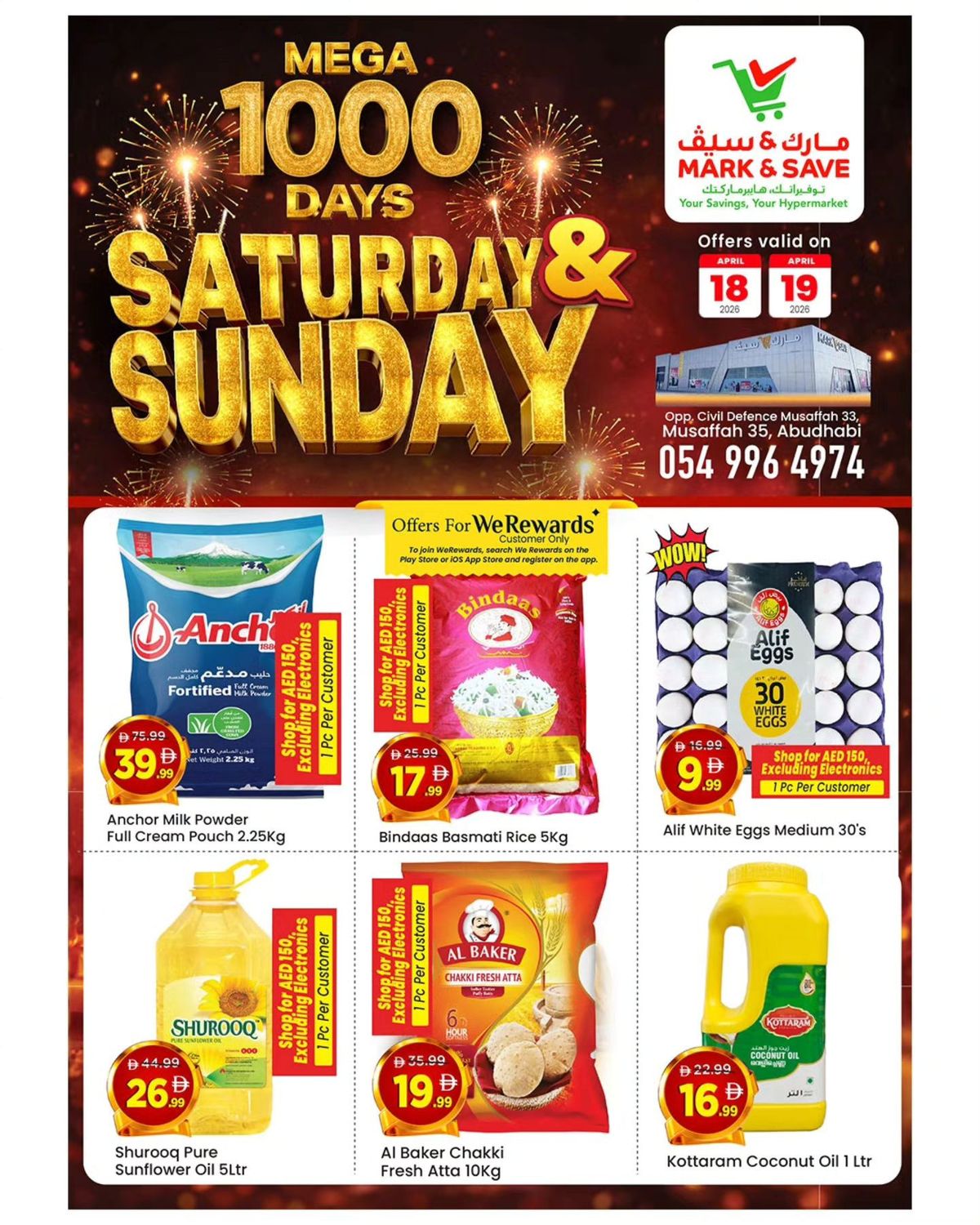 Mark & Save has released Saturday And Sunday Deals catalog in Abu Dhabi, UAE - Musaffah from Apr 18, 2026 to Apr 19, 2026 in 1 branch(s).