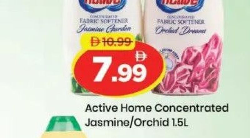 Active Home concentrated fabric softener in Jasmine or Orchid scents, 1.5 liters.