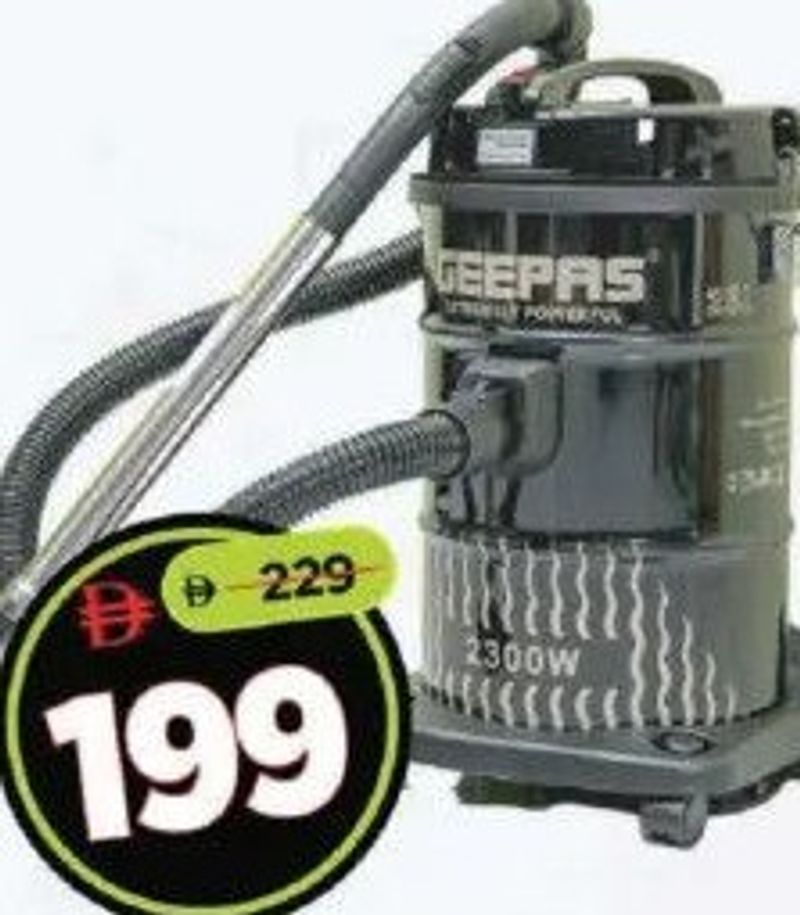 A Geepas drum vacuum cleaner with 2300W power, suitable for heavy-duty cleaning.