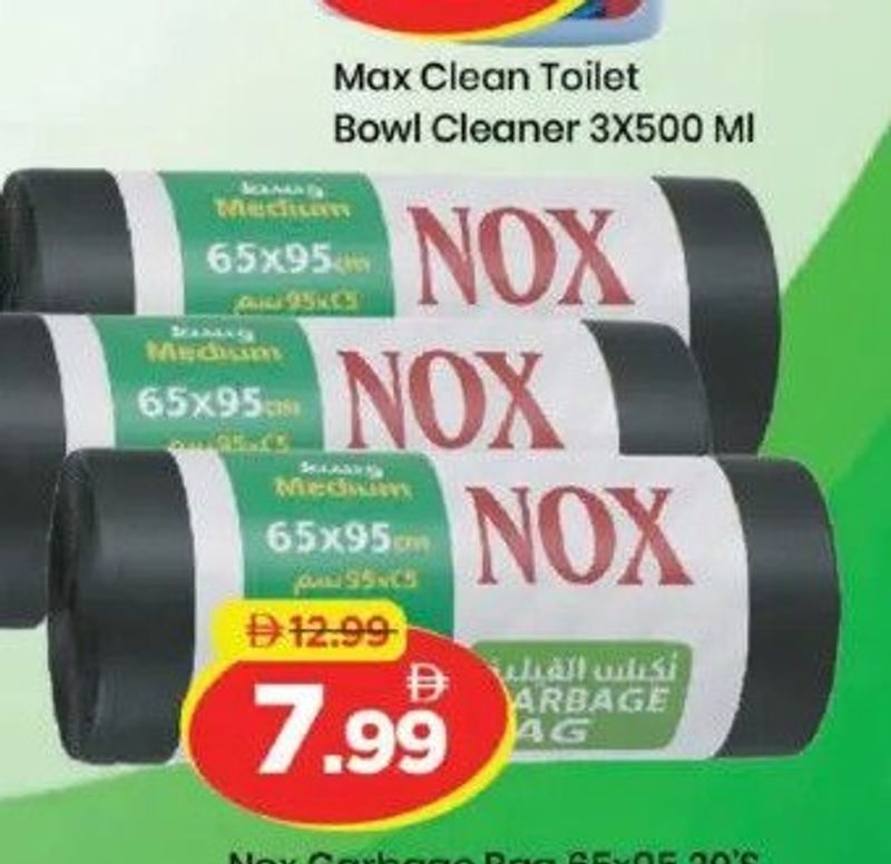 Nox garbage bags in various sizes (65x95 20pcs, 90x110 10pcs, 75x103 15pcs), buy 2 get 1 free offer.