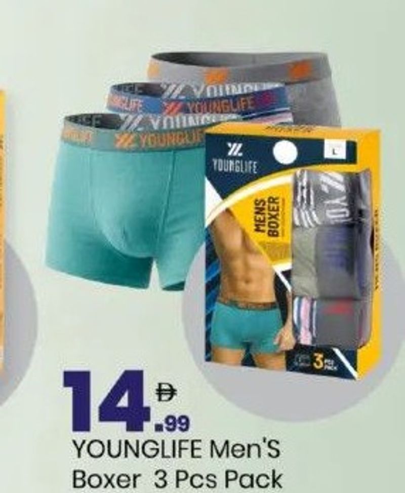 A three-piece pack of men's boxers by Younglife, designed for a comfortable fit.