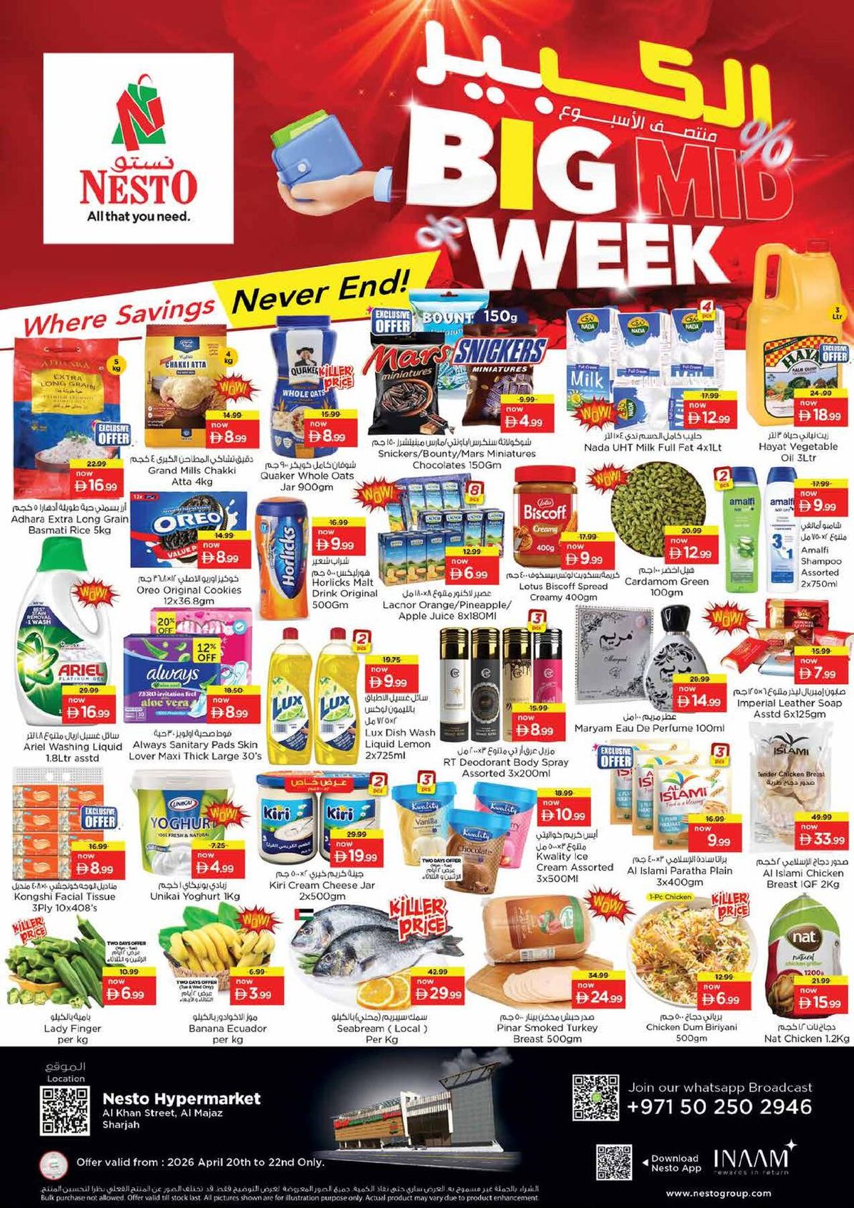 The latest Midweek Deals from Nesto brings a competitive lineup of offers to the UAE market. Valid from Apr 20, 2026 to Apr 22, 2026, this catalog represents one of the strongest mid-week promotional drops we track in Sharjah. At Cliq Deals, we analyze hundreds of retail circulars, and Nesto consistently delivers value on bulk grocery staples, fresh produce, and household essentials.