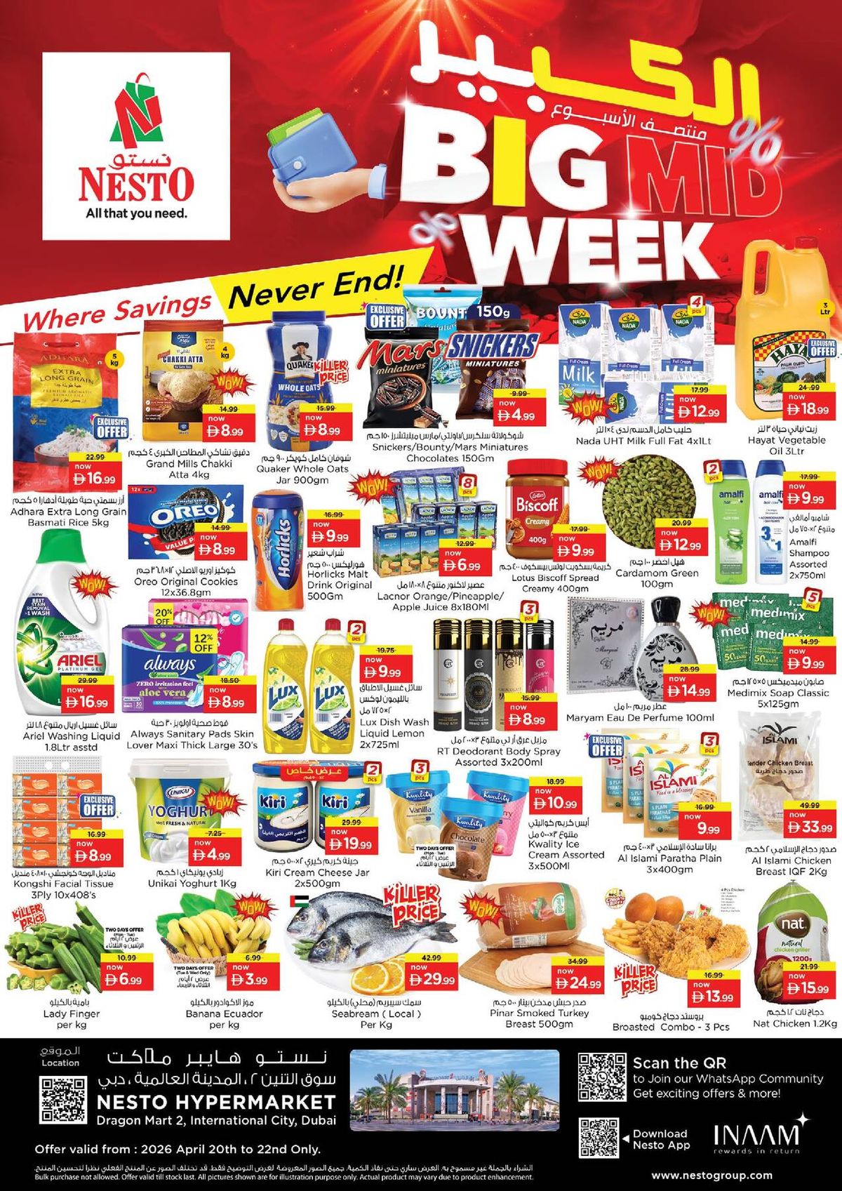 The latest Midweek Deals from Nesto brings a competitive lineup of offers to the UAE market. Valid from Apr 20, 2026 to Apr 22, 2026, this catalog represents one of the strongest mid-week promotional drops we track in Dubai. At Cliq Deals, we analyze hundreds of retail circulars, and Nesto consistently delivers value on bulk grocery staples, fresh produce, and household essentials.