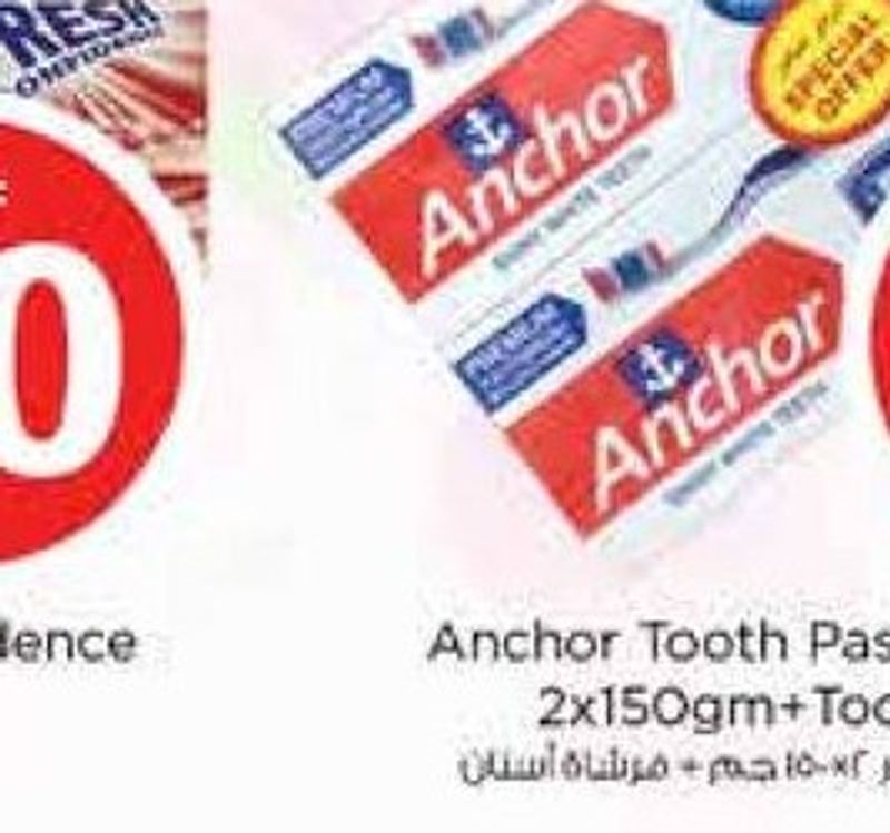 Anchor Whitening Tooth Paste, 2 tubes of 150gm each, bundled with a free toothbrush.