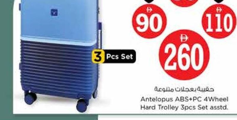 3 Pcs Set of Antelopus ABS+PC 4-wheel hard trolleys. Available in 20", 24", and 28" sizes with individual prices of 80 AED, 90 AED, and 110 AED respectively.