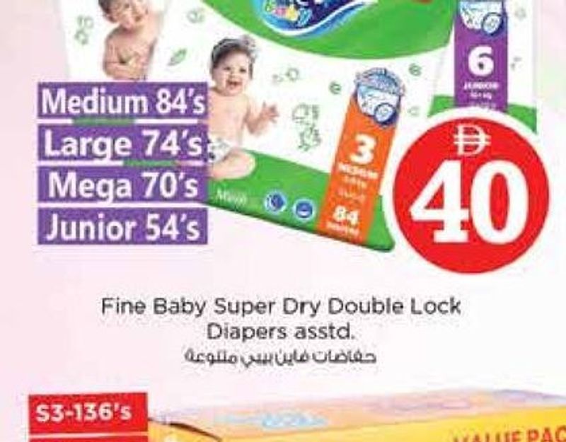 Fine Baby Super Dry Double Lock Diapers asstd. Medium 84's, Large 74's, Mega 70's, Junior 54's