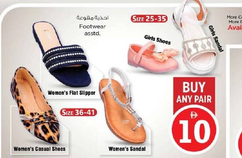 Assorted footwear including women's flat slippers, casual shoes, sandals, and girls' shoes and sandals. Buy any pair for AED 10.