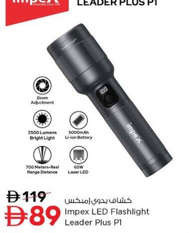 An Impex LED flashlight, Leader Plus P1, featuring 2500 lumens and 5000mAh Li-ion battery.