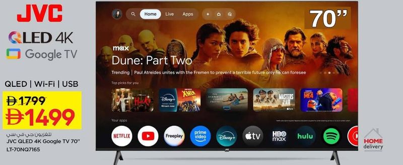 JVC QLED 4K Google TV 70 inch with Wi-Fi and USB connectivity. Model LT-70NQ7165.