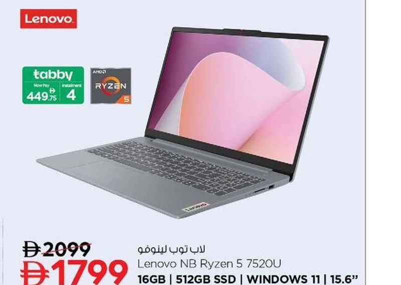 Lenovo Notebook with AMD Ryzen 5 7520U processor, 16GB RAM, 512GB SSD, Windows 11, and a 15.6-inch screen.