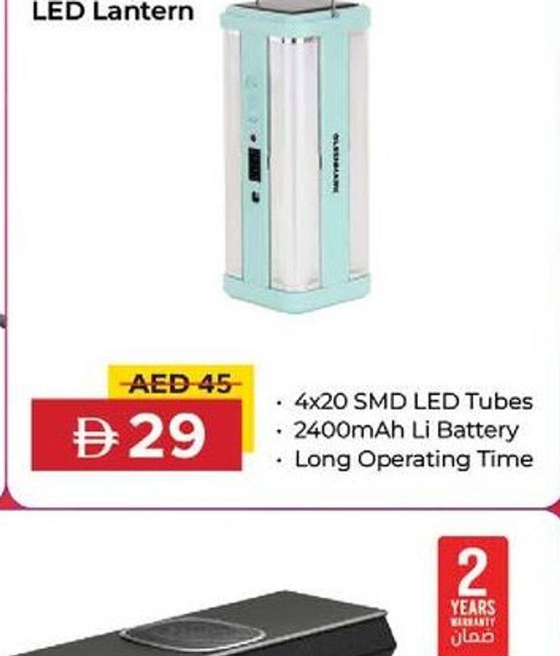 A rechargeable LED lantern with 4x20 SMD LED tubes, 2400mAh Li battery, offering long operating time.
