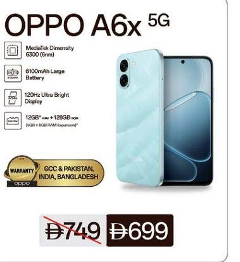 OPPO A6x 5G smartphone with 12GB RAM and 128GB internal storage.