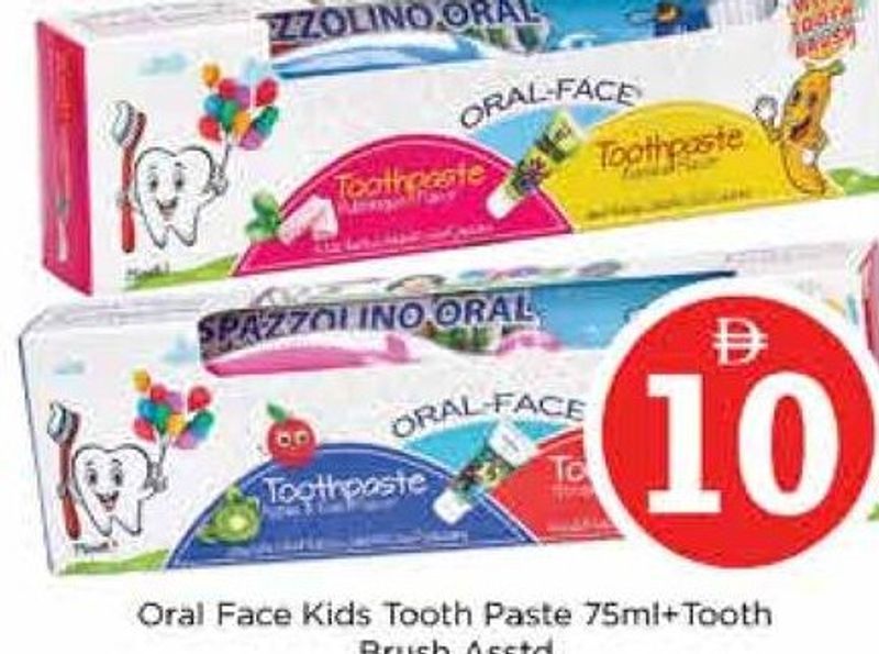 Oral Face Kids Tooth Paste, 75ml, assorted flavors, bundled with a toothbrush.