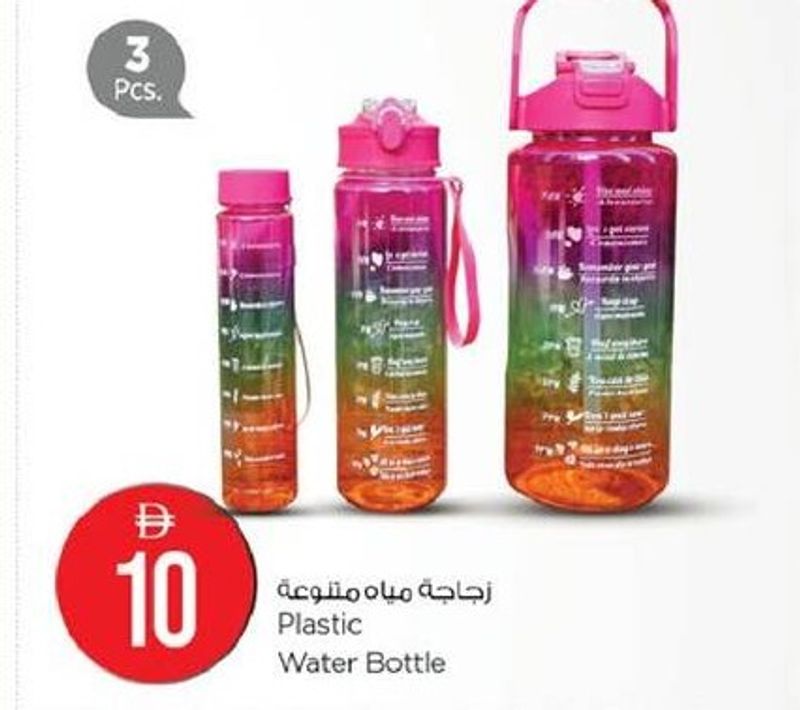 A 3-piece set of colorful plastic water bottles, ideal for hydration on the go or for daily use.