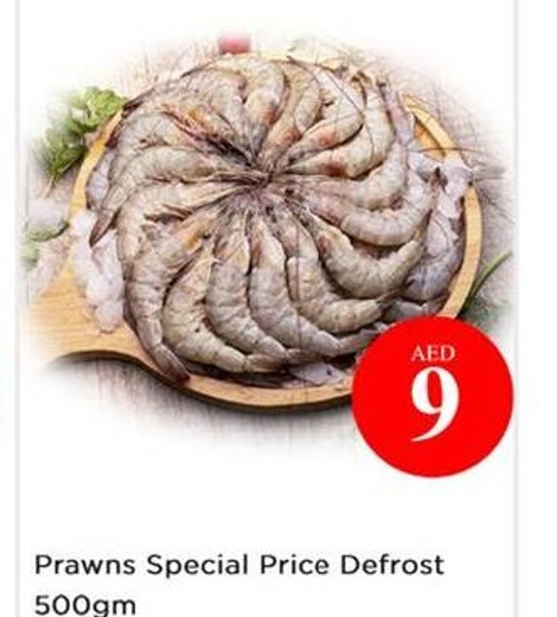 Defrosted prawns offered at a special price, available in a 500-gram pack.