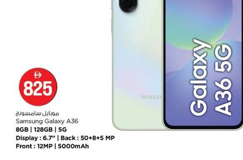 Samsung Galaxy A36 5G mobile phone with 8GB RAM and 128GB storage, featuring a 6.7-inch display, 50+8+5 MP back camera, and 12MP front camera with a 5000mAh battery.