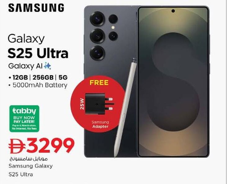 Samsung Galaxy S25 Ultra smartphone with 12GB RAM, 256GB storage, 5G connectivity, and 5000mAh battery. Includes a free 25W Samsung Adapter.