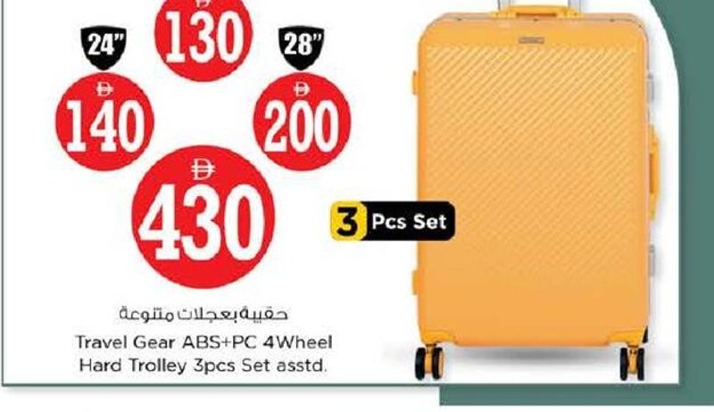 A 3-piece set of Travel Gear ABS+PC 4-wheel hard trolleys, available in assorted sizes (20", 24", 28").