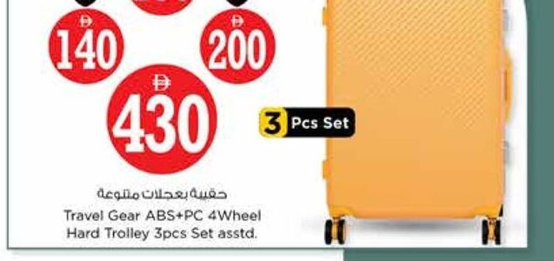 3 Pcs Set of Travel Gear ABS+PC 4-wheel hard trolleys. Available in 20", 24", and 28" sizes with individual prices of 130 AED, 140 AED, and 200 AED respectively.
