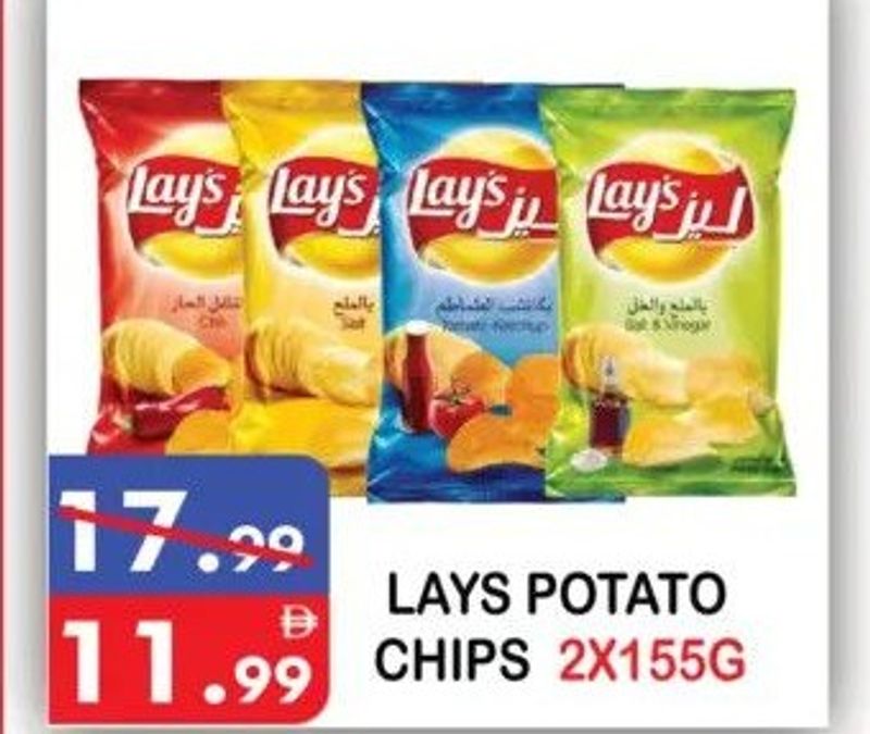 Two packs of Lays potato chips, 155g each, available in assorted flavors.
