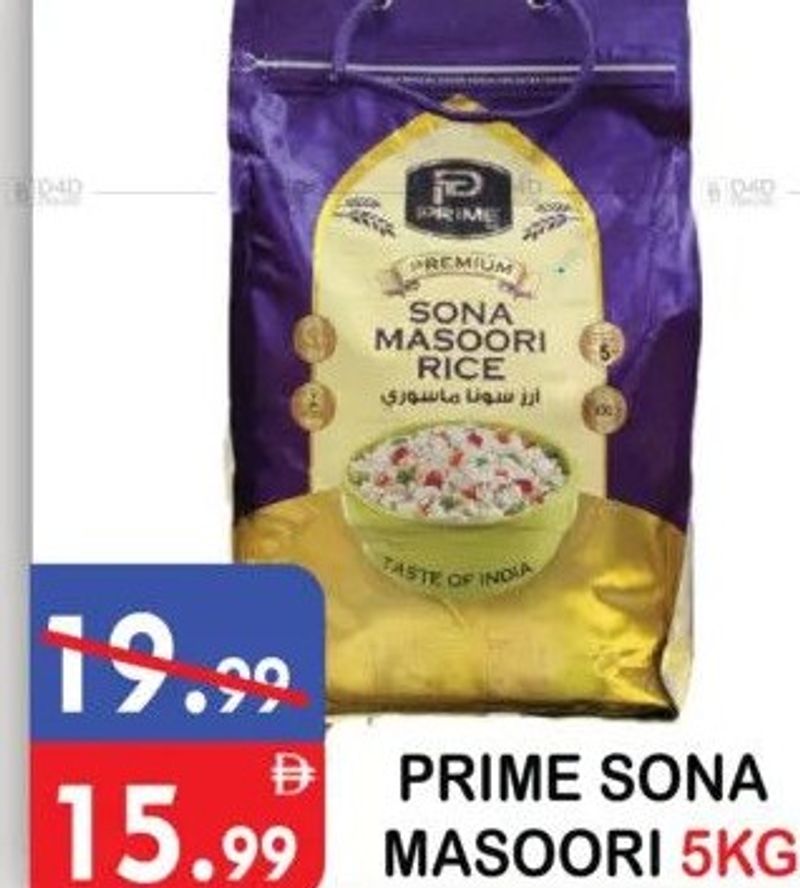 A 5kg bag of Prime Sona Masoori Rice, available at a special discounted price.