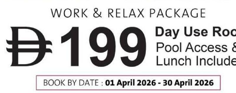 Day Use Room with Pool Access & Lunch Included at Mövenpick Grand Al Bustan Dubai. Package includes unlimited 24/7 Wi-Fi access, complimentary access to swimming pool and fitness club, and all taxes. Booking valid from 01 April 2026 to 30 April 2026.